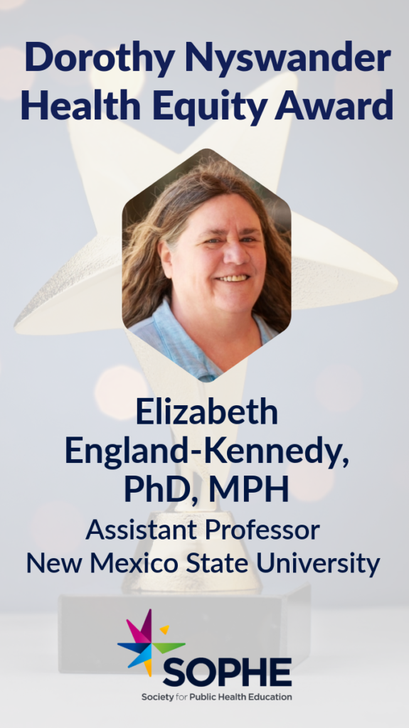 “I was surprised to learn that I had been selected for the honor of receiving the Dorothy Nyswander Health Equity Award,” said England-Kennedy, an assistant professor at New Mexico State University. “While I believe that my work is important and addresses the needs of populations that are highly marginalized, I also know that many, many people are also addressing health inequity and working hard to empower people and increase social and environmental justice. Because of this, I feel very honored and humbled to have received it. I am grateful to my community and professional partners and my students who have helped in this work and proud to have accomplished all we have!”