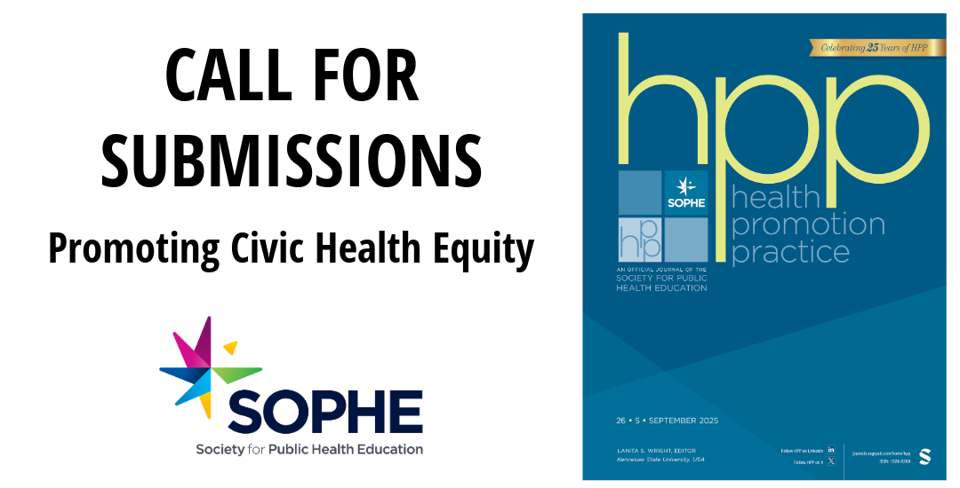 To learn more about the Health Promotion Practice submission process, please review our manuscript submission guidelines and submit manuscripts here: HPP Manuscript Submission Guidelines. When submitting your manuscript, select “Special Focus Submission – Civic Health” when asked if you are responding to a special issue/call for papers.