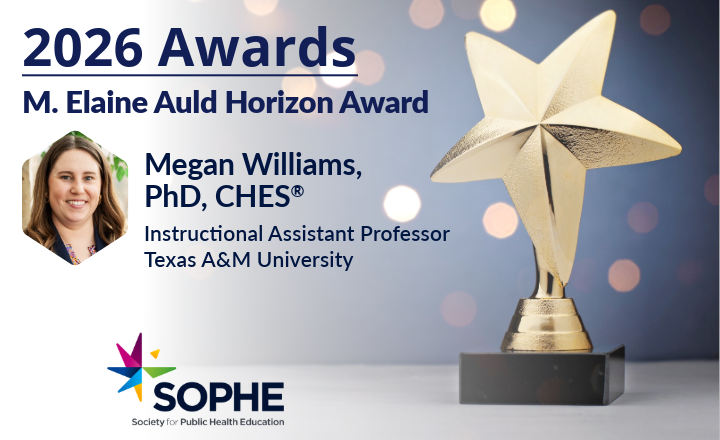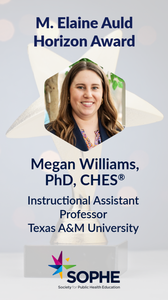 ALEXANDRIA, VA – The Society for Public Health Education (SOPHE) is proud to announce that Dr. Megan Williams will be awarded the M. Elaine Auld Horizon Award during the 2026 Annual Conference in Portland, OR, April 22-24.