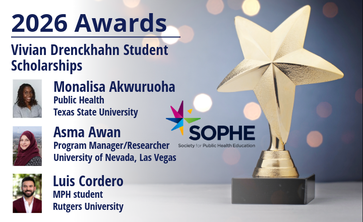 ALEXANDRIA, VA – The Society for Public Health Education (SOPHE) is proud to announce that Monalisa Akwuruoha, Asma Awan and Luis Corderowill be awarded the Vivian Drenckhahn Student Scholarships during the 2026 SOPHE Annual Conference in Portland, April 22-24.
