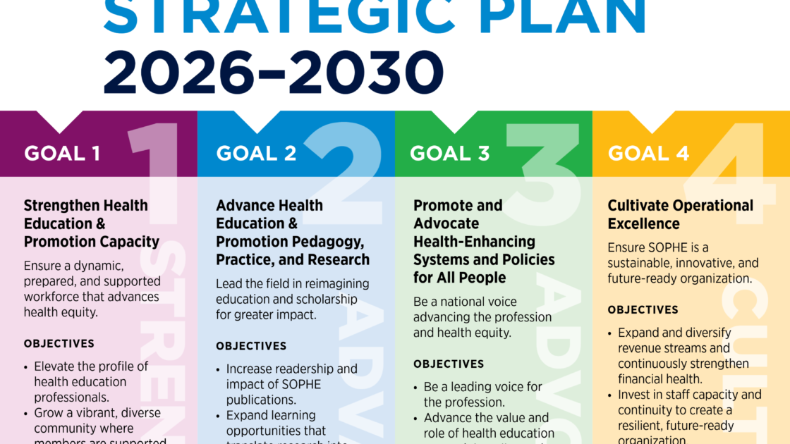 SOPHE is dedicated to promoting and advancing the expertise of health educators and the impact of health education. As a membership organization, SOPHE works with its members and partners to improve the health and well-being of all people through the skills and capacities of health education and health promotion. The revised strategic plan for 2026-2030 reflects its vision, mission and core values.