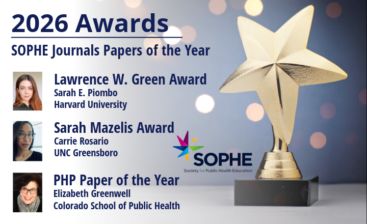 ALEXANDRIA, VA – The Society for Public Health Education (SOPHE) is proud to announce the recipients of its 2026 Paper of the Year Awards, recognizing exceptional scholarship published in SOPHE’s three peer-reviewed journals: Health Education & Behavior (HE&B), Health Promotion Practice (HPP), and Pedagogy in Health Promotion (PHP). These awards honor outstanding contributions to health education research, practice, and pedagogy that advance the field and promote health equity.