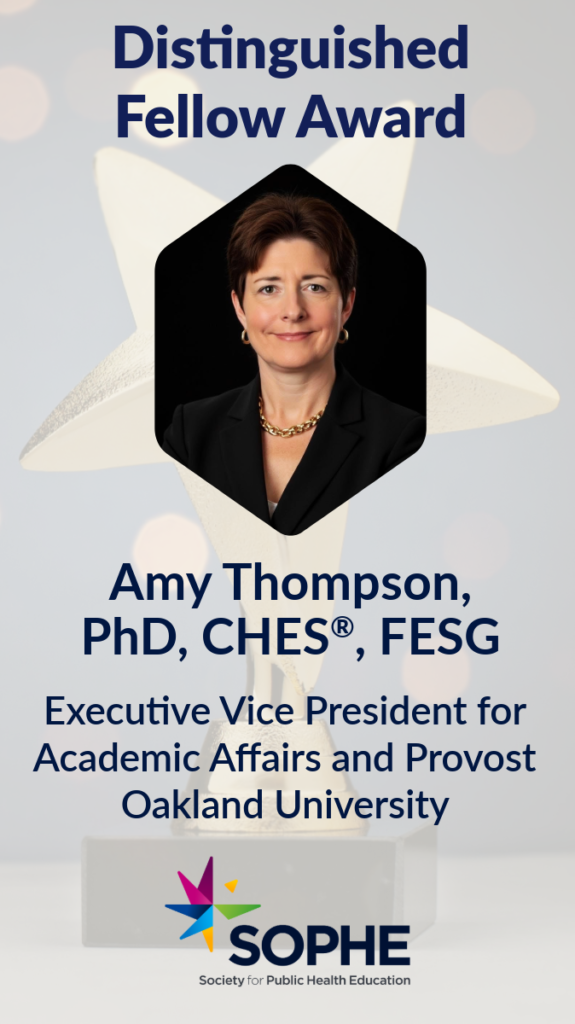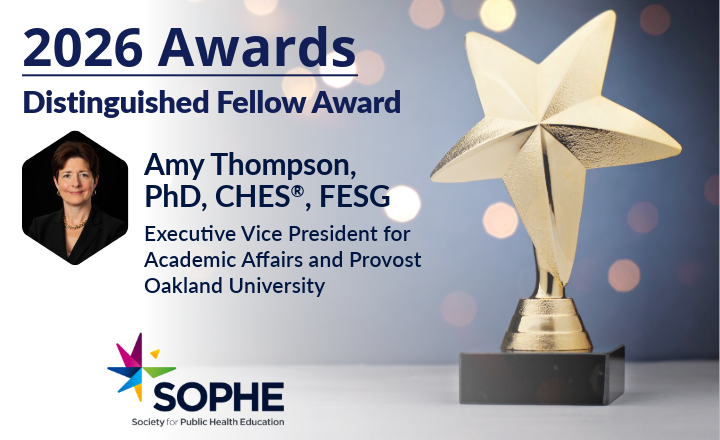 ALEXANDRIA, VA – The Society for Public Health Education (SOPHE) is proud to announce that Dr. Amy Thompson will be awarded the Distinguished Fellow Award during the 2026 Annual Conference in Portland, April 22-24.